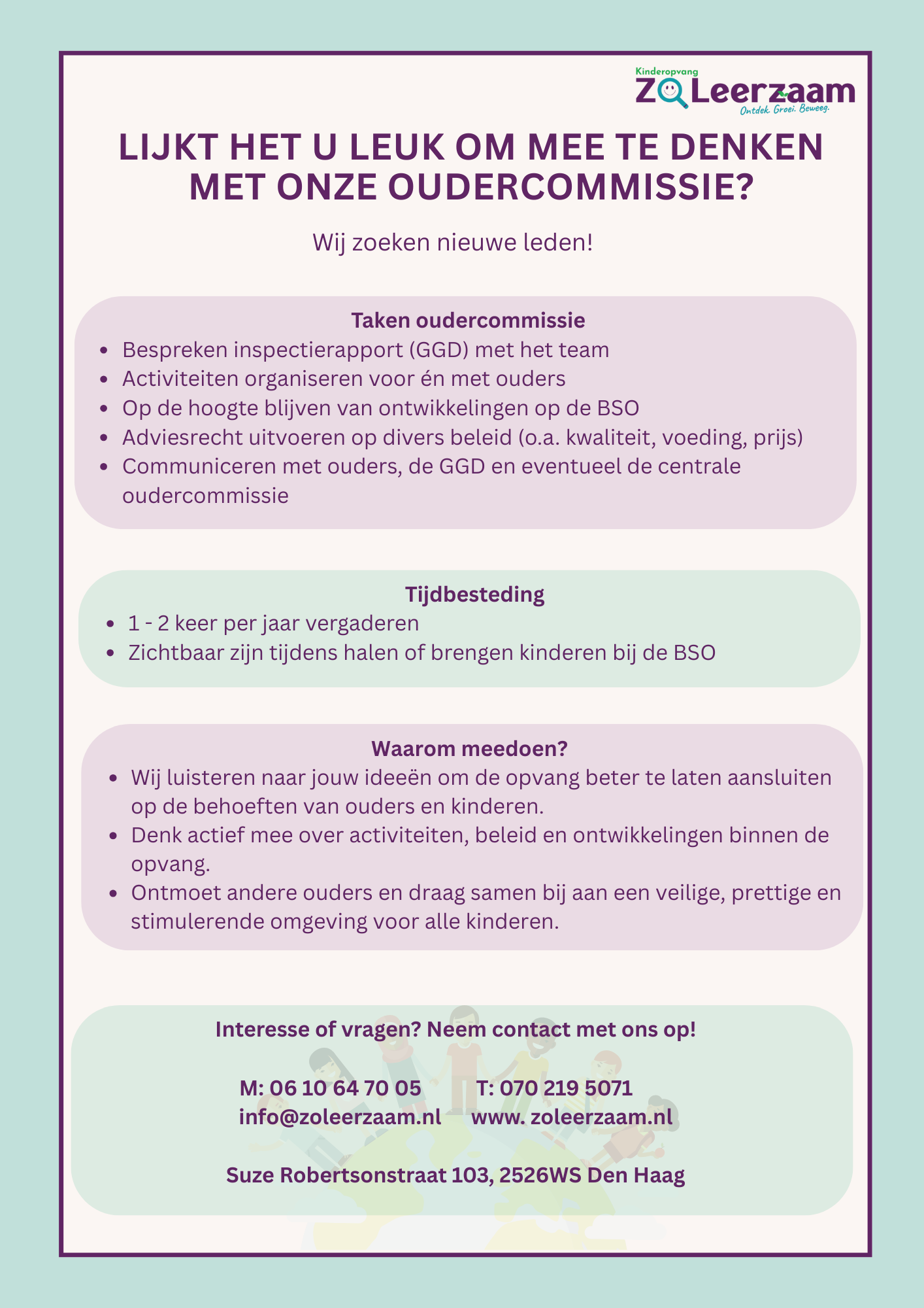De taak van de oudercommissie bij Zo Leerzaam Kinderopvang is het behartigen van de belangen van de ouders. Minimaal twee ouders van kinderen die op de kinderopvang geplaatst zijn, maken deel uit van de oudercommissie.